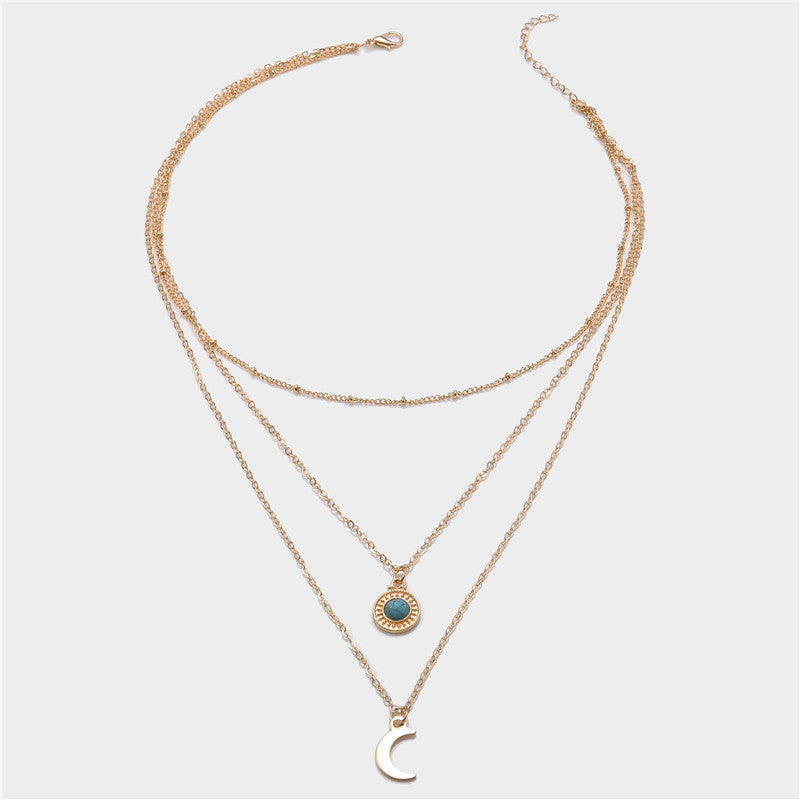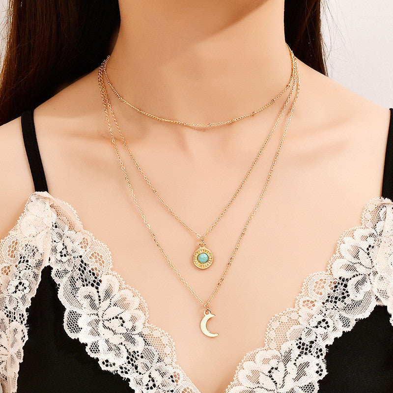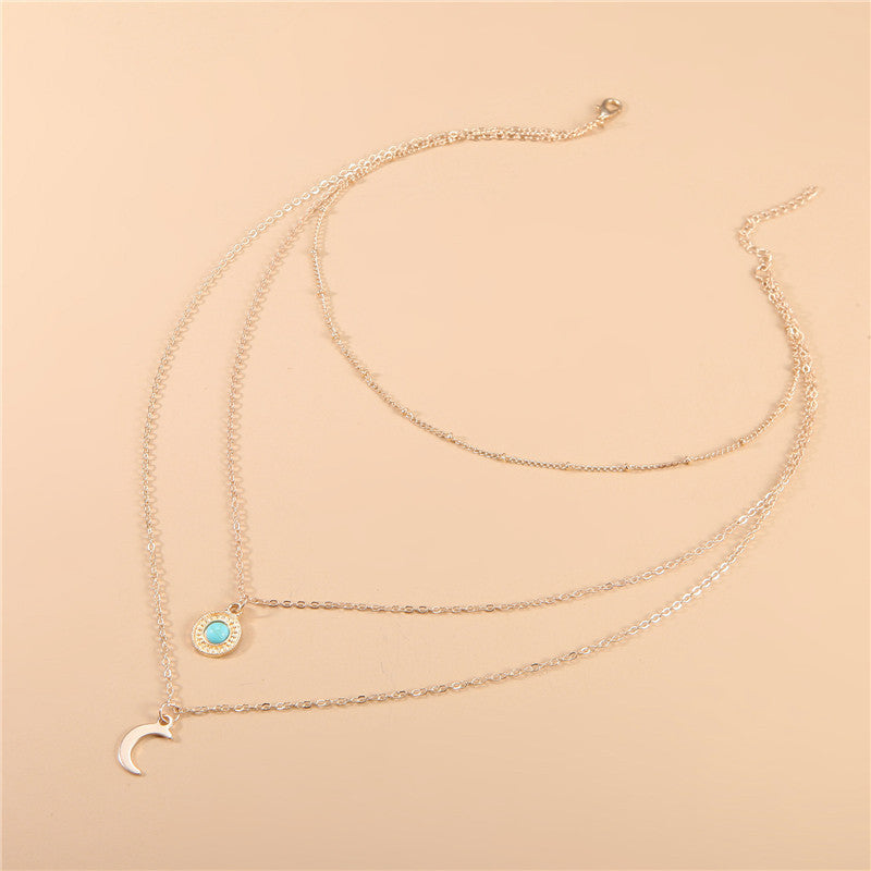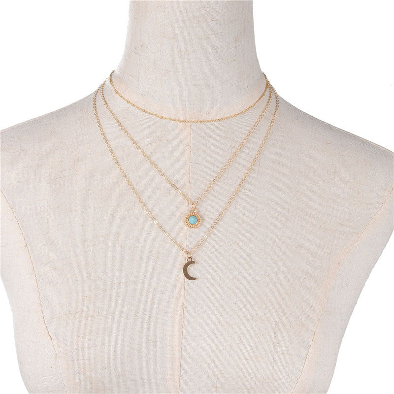 Turquoise Multilayer Necklace Metal Moon Pendant Necklace